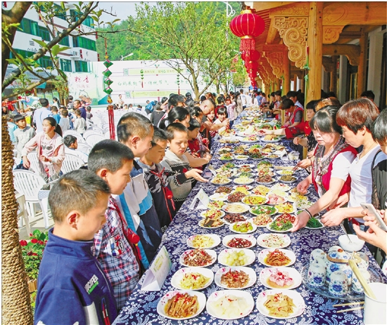 景宁东坑镇发展高山蔬菜等产业,小咸菜成了大产业。图为当地孩子参观“咸菜宴”。