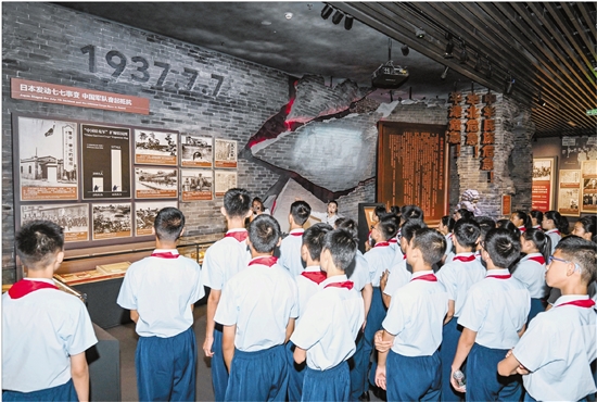7月7日上午,纪念全民族抗战爆发88周年仪式暨《为了民族解放与世界和平》主题展览开幕式在中国人民抗日战争纪念馆举行。图为北京市第十二中学的少先队员参观主题展览。 新华社记者 陈晔华 摄