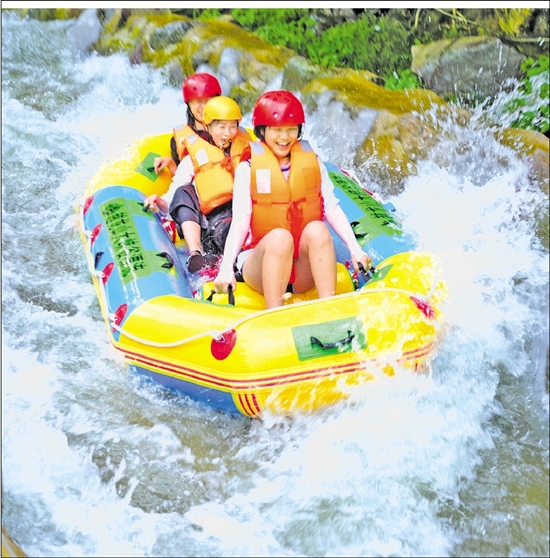 7月10日,金华市兰溪越龙山国际旅游度假区,游客正在峡谷溪水中漂流。