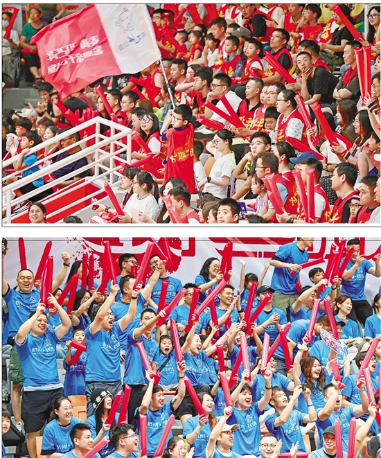 临平(红衣)、钱塘(蓝衣)两地球迷为球队加油助威。