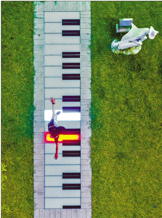 游客在村里的感应键盘装置上“弹奏”钢琴曲。