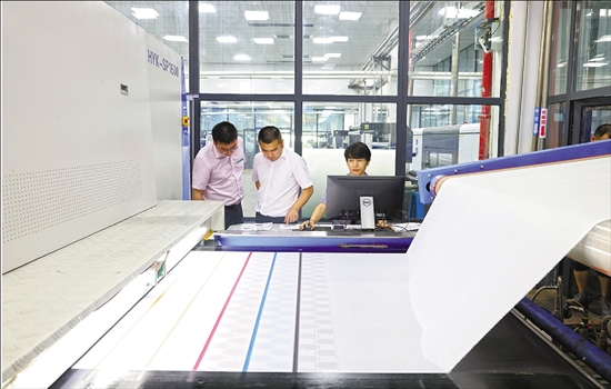 农行绍兴诸暨市支行在印染企业车间了解外贸订单情况和数码印刷技术应用情况。