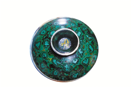 记者在钟宏云的指导下,完成了大漆瓷茶碗髹饰。图为“画”上了甲骨文“飞”字的碗盖。 共享联盟·武义 蒋凌顶 摄