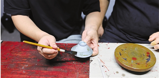 记者沈立(左)在钟宏云指导下,将大漆底漆刷到茶碗瓷胎上。 共享联盟·武义 陈芮 摄