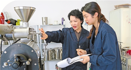 余菲(左)教记者(右)烘焙咖啡。 共享联盟·青田 王晓蕾 摄