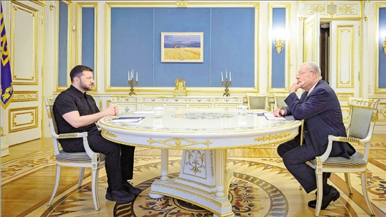 当地时间7月14日,乌克兰总统泽连斯基(左)在首都基辅与美国乌克兰事务特使基思·凯洛格交谈。 CFP供图