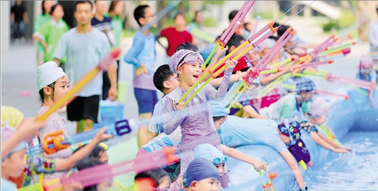 7月14日,圣奥集团第十二届小候鸟员工子女暑期班在杭州开班,来自全国各地的小候鸟在园区搭建的水上乐园玩得不亦乐乎。暑期班对全体员工免费开放,将持续一个月左右,共开设18个班级,满足不同年龄孩子的需求。 本报记者 魏志阳 实习生 陈阷陑 摄 |