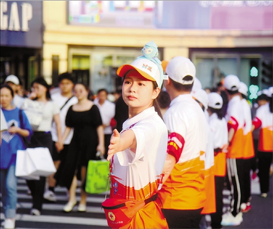 杭州延安路平海路口,“最美人墙”开展文明交通劝导志愿服务。 受访单位供图