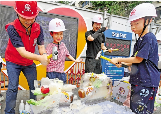 杭州市凯旋街道景秀社区组织辖区内地铁工地员工子女开展“夏日送清凉”主题活动,“小候鸟”们与爸爸一起砸开冻结着棒冰、水果的大冰块,享受清凉。 本报记者 林云龙 摄