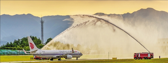 丽水机场首个进港航班正在经过“水门”。 本报记者 邱建平 董旭明 共享联盟·丽水 程昌福 摄