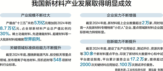 产值由“十三五”末的5万亿元增加到2024年的8.7万亿元,占全球新材料产业总产值比例约30%。稀土功能材料、先进储能材料、超硬材料等一大批新材料规模居世界前列。