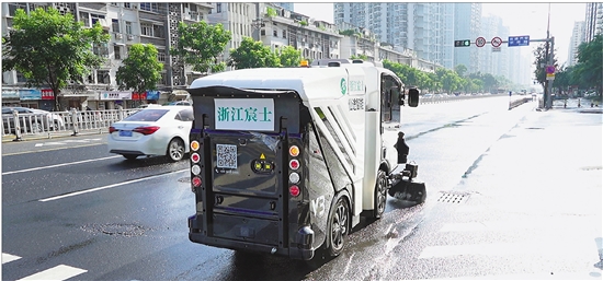 正在街头作业的无人环卫车。