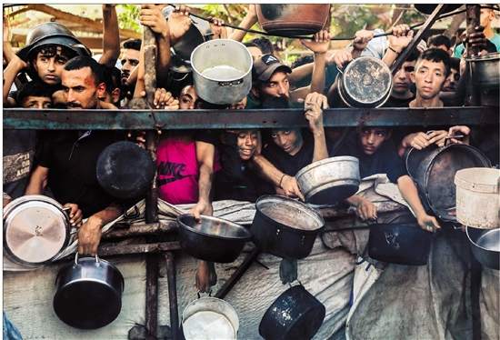 7月20日,在加沙城,当地民众等待领取食物。 新华社发(里泽克·阿卜杜勒贾瓦德 摄)