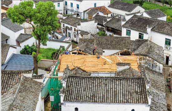 7月21日,兰溪市诸葛镇诸葛村,施工人员对民居古建筑屋顶进行补修。本次纳入修缮范围的8处古建筑,预计在11月底前完工,既保障居住安全,也为游客呈现更完整的古村风貌。