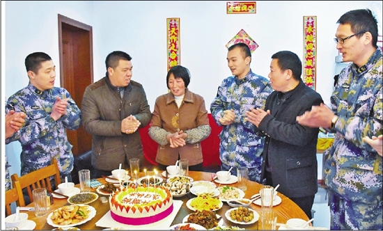 2月6日,部队官兵庆祝“兵妈妈”全国爱国拥军模范孙芬年的生日。