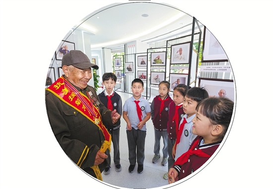 抗美援朝老战士向少先队员讲述战斗故事。