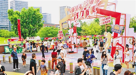 7月26日,“浙BA”杭州赛区两场半决赛在杭州拱墅运河体育公园体育馆打响。图为场外人气火爆的“浙BA·运河潮”活力市集。