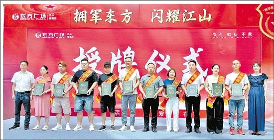 在“拥军东方 闪耀江山”拥军商城活动启动仪式上,江山市退役军人事务局领导拥军商家代表举行授牌仪式。