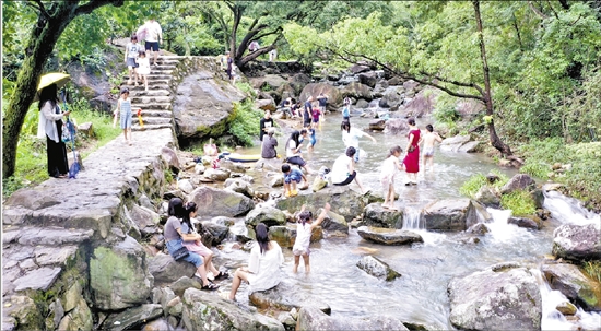 盛夏骄阳下,温岭市温峤镇白岩下村溪流潺潺,众多游客在嬉水纳凉。 周学军 摄