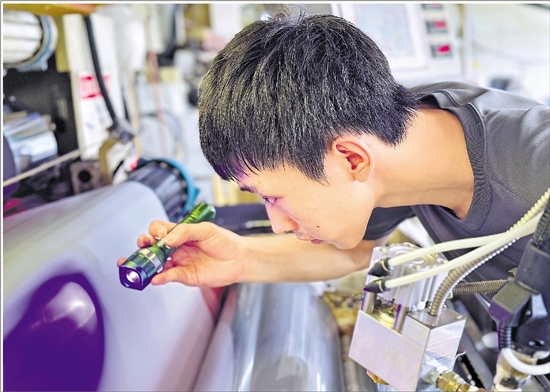 绍兴柯桥某企业,技术人员正用紫外线检验面料胶水转移的均匀性。 受访者供图