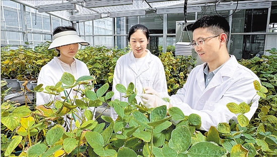 在传化生物的温室中,陈晓超(右一)与团队成员观察大豆植株性状。 受访者供图