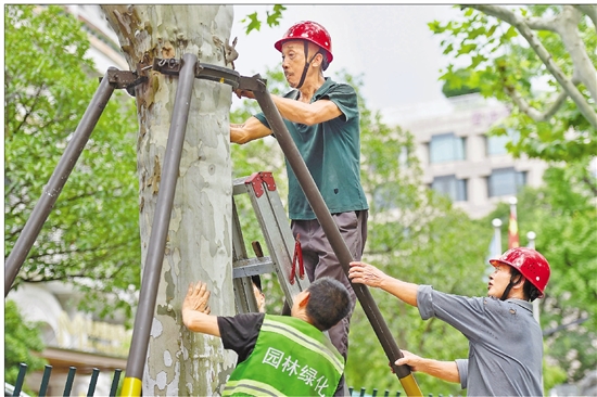 7月29日16时,台风“竹节草”中心位于舟山市东南方向约250公里的海面上,将于30日白天在浙江舟山到江苏启东一带沿海登陆。省防指在29日15时将防台风应急响应提升至Ⅲ级。全省各地迅速迎战,全力筑牢防线。图为29日工人正加固杭州湖滨路的行道树。 本报记者 潘海松 摄 (更多内容详见第三版) |