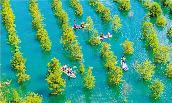 | 8月3日,长兴县龙山街道的桃花岕森林公园内,各地游客在绿水青山间体验桨板、皮划艇等水上运动,乐享夏日清凉。日前,长兴县推出太湖9号公路生态文旅走廊、太湖有风青年集市等丰富多彩的夏日主题旅游线路,持续激发暑期文旅经济新活力。 通讯员 谭云俸 摄 |