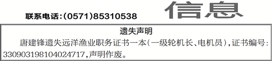 唐建锋遗失远洋渔业职务证书一本(一级轮机长、电机员),证书编号:330903198104024717,声明作废。