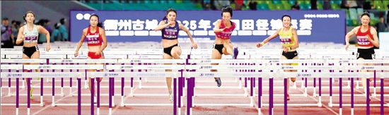 8月4日晚,吴艳妮(左三)在全国田径锦标赛女子100米栏决赛中夺冠。图为比赛现场。 本报记者 钱洁瑗 摄