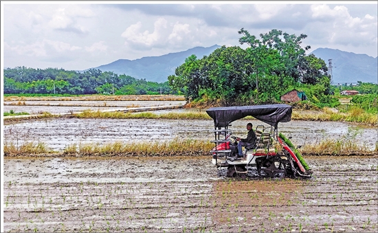 8月4日,仙居县白塔镇高迁村,农民驾驶插秧机进行晚稻插秧作业。 通讯员 王华斌 摄