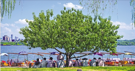 8月8日,正午时分,杭州西湖手划船的船工们在大树下躲避烈日。 本报记者 董旭明 摄
