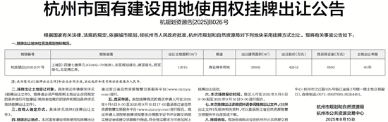 五、竞买申请。参加挂牌竞买的竞买申请人可在2025年9月6日9∶00至2025年9月15日17∶00登录浙江省自然资源智慧交易服务平台(www.zjzrzyjy.com)进行报名。竞买申请人须按照挂牌须知要求办理数字证书并足额交纳竞买保证金或提交足额银行保函,符合竞买要求方可参加网上挂牌出让活动。