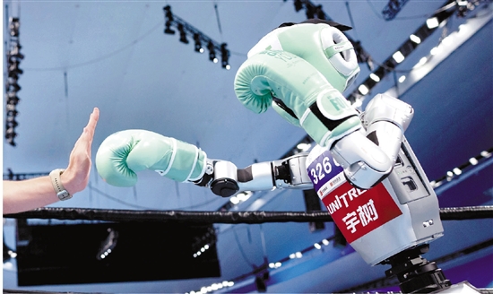 走下拳台,刚刚赢得比赛的人形机器人与人类碰拳庆祝。