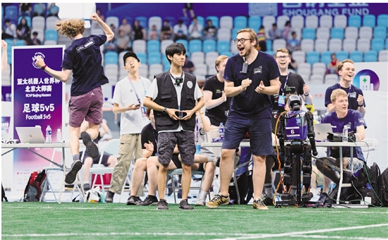 赢得一场机器人足球赛事后,来自德国的HTWK战队成员兴奋庆祝。