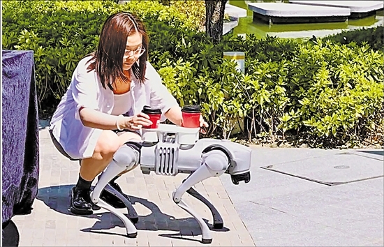 在玉皇山南基金小镇,工作人员从机器狗身上取下咖啡。 本报记者 周逸 摄