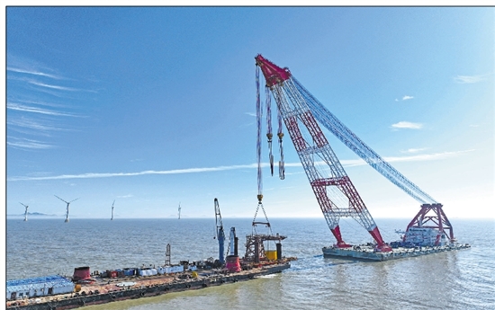 华电玉环南区海上风电建设,起重船正将风电基础构件精准吊装至预定海域,展现海上风电建设的核心作业场景,镜头定格了工程机械与海洋风能的交响,记录向“双碳”目标迈进的坚实步伐。