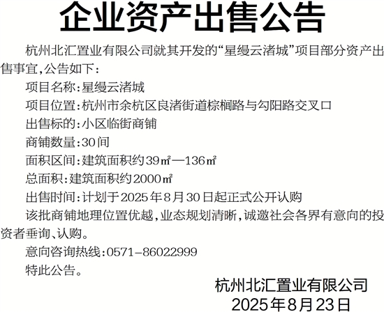 杭州北汇置业有限公司就其开发的“星缦云渚城”项目部分资产出售事宜,公告如下: