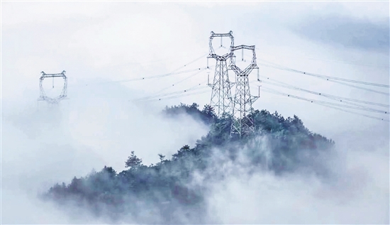 嵊州甘霖云雾中的500千伏线路