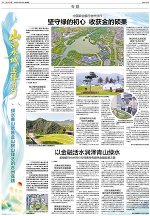 二十年来,我国生态文明建设与绿色发展不断深化推进,绿色金融成为绿色发展的重要支撑,成为“两山”理念的重要践行者。在“两山”理念指引下,绿色金融正在上演一场精彩的“点绿成金”术。而作为绿色金融的“国家队”,中国农业银行台州分行(简称农行台州分行)20年间始终秉持“绿的初心”,深耕台州,通过构建绿色金融专营体系、绿色金融专营模式、绿色金融特色产品,积极推动绿色金融与数字金融、转型金融、开放金融、海洋金融等深度融合,一步一个脚印把生态资源变成发展“金果”,谱写好绿色金融大文章。