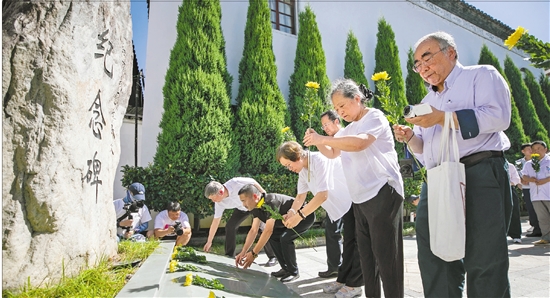 今年7月7日,南香红(中)、王选(右二)等人在侵华日军细菌战衢州陈列馆纪念碑前献花。 本报记者 钱洁瑗 摄