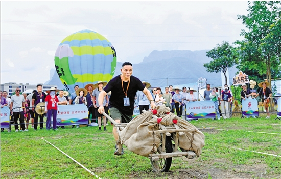 | 9月20日,中国农民丰收节全民健身主题活动暨浙江省第五届体育大会丰收体育嘉年华在仙居县白塔镇举行。来自浙江、江苏、上海、山东、福建、安徽等地的500余名选手分别参与泥塘摸鱼、推小轮车、田地拔河、赶花猪等趣味运动项目比赛。图为推小轮车比赛现场。 通讯员 王华斌 摄 |