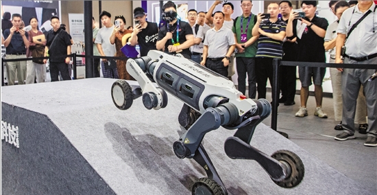 在2025世界智能产业博览会上,云深处科技展台的“山猫M20”轮足机器狗在演示障碍翻越能力。 新华社记者 唐奕 摄