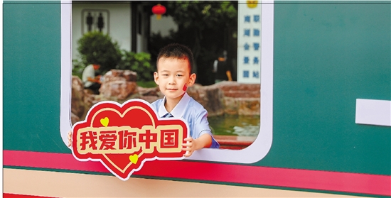 10月1日,在嘉兴南湖景区,小朋友手持祝福语拍照留念。