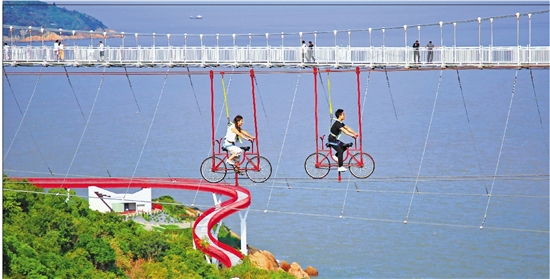 10月1日,玉环市干江镇上栈头景区,游客体验玻璃吊桥、高空骑车等项目,欢度假期。 通讯员 段俊利 摄