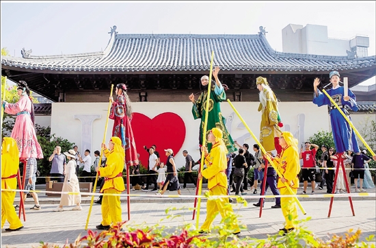 10月1日,衢州古城非遗秀与游客见面,丈二高跷“八仙送福”为游客送上节日祝福。