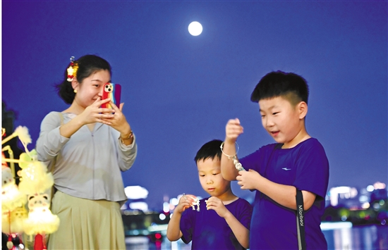 10月6日,华灯初上,人们不约而同漫步杭州西湖边,同赏一轮明月,共度团圆之夜。