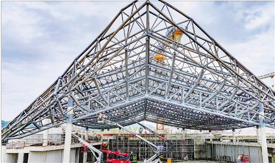 温州园博园项目山水中国馆建设现场,工人正在进行金属屋面安装。 共享联盟·瓯海 陈明铭 摄