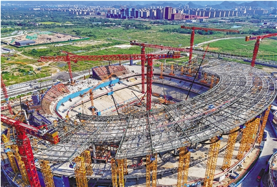 10月11日,杭州余杭国际体育中心建设工地,建筑工人在钢屋盖上登高作业。目前,一场两馆的主体结构施工已完成95%以上。 本报记者 董旭明 摄