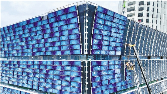 10月16日,杭州市拱墅区运河之畔,中国京杭大运河博物院二期工程的施工现场,工人们正在安装蓝色琉璃复合板幕墙。目前该工程已全面进入装饰装修阶段,预计年底即可整体竣工亮相。 本报记者 周旭辉 摄