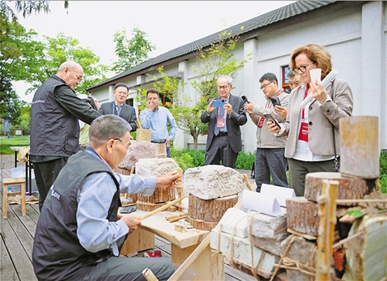 “实践创新:城址考古、大遗址保护与城乡协同发展”分论坛间隙,中外专家观看复原石器工艺制作良渚玉器的过程。 本报记者 倪雁强 摄